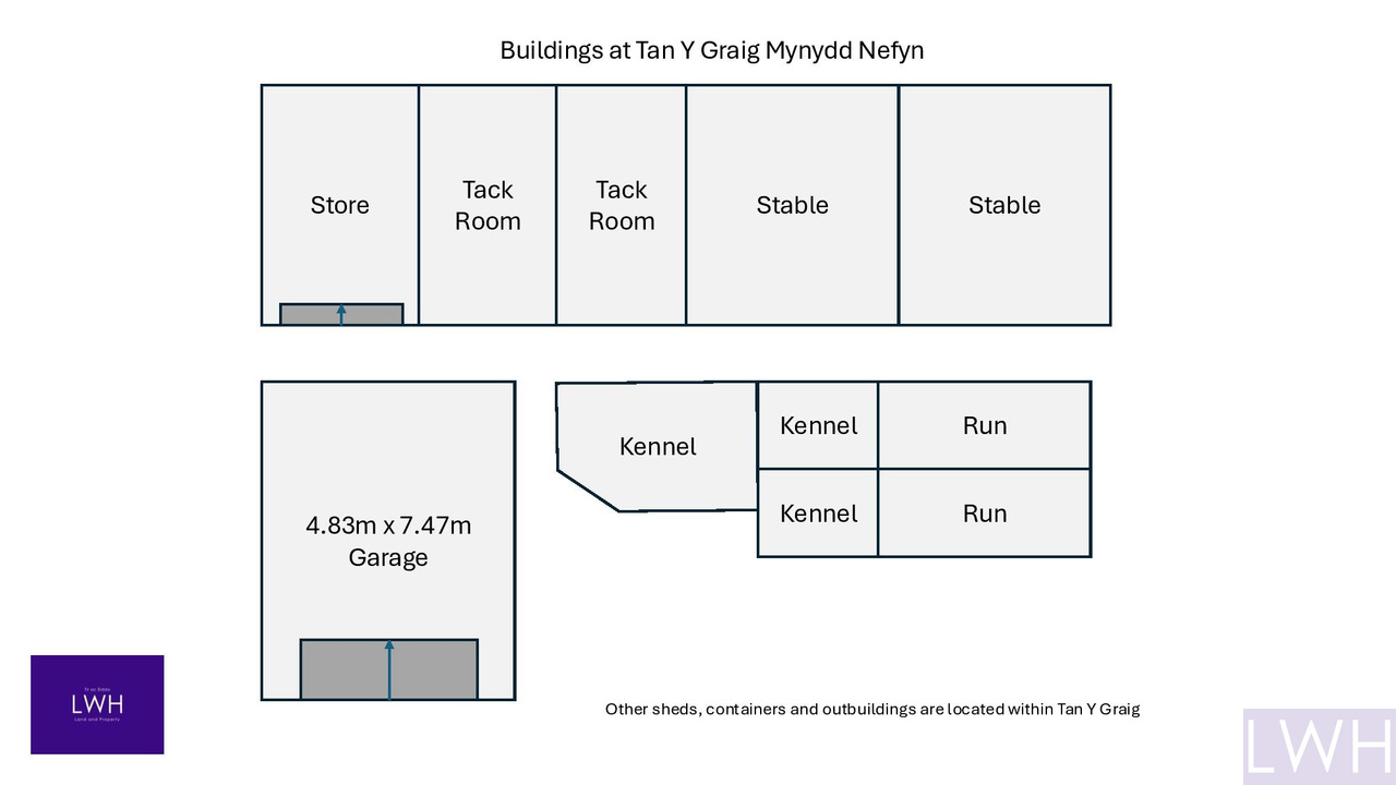 Externally, Tan Y Graig features fenced paddocks, a range of stables, kennels, and a detached garage. To the side of the main entrance, there's a yard or plot with separate access to the lane, offering potential for further development, subject to consent, with services in place.